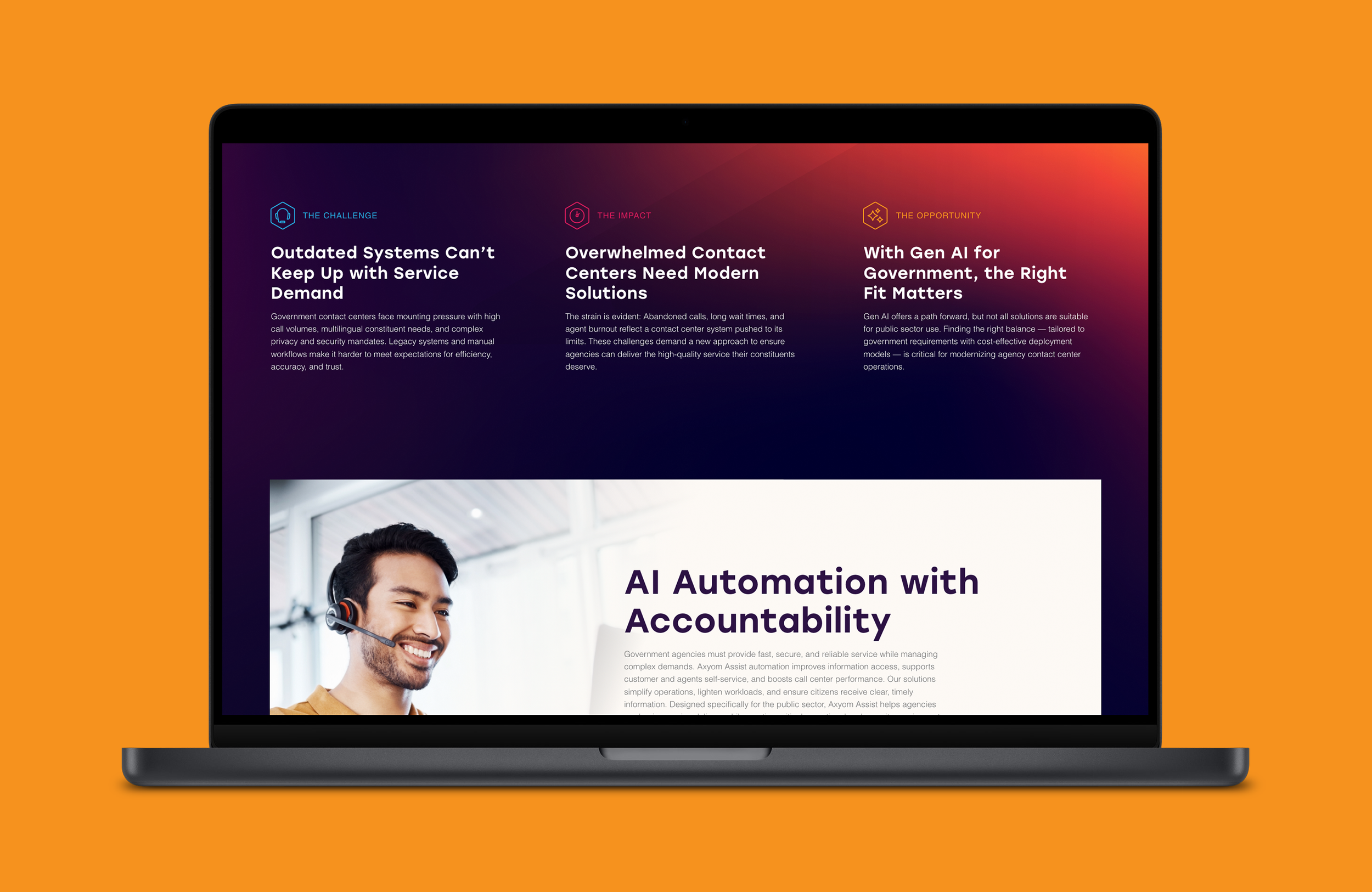 For Axyom, a company redefining public sector customer service with transparent, AI-driven contact center solutions, I led the translation of their business vision into a cohesive digital brand experience. Starting from their core mission, I developed a new color palette, typography system, and comprehensive style guide, along with custom graphics and a modern web design. The final website balances clarity, trust, and innovation—reflecting Axyom’s commitment to confidence, agility, and the unique demands of government interactions.